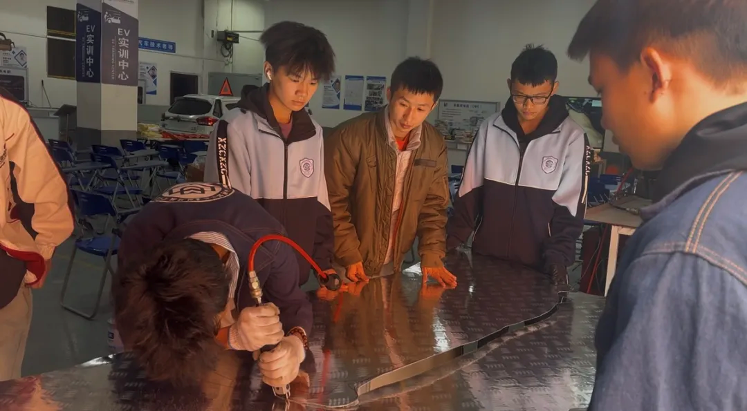 此前,该校师生已完成一辆活力橙敞篷车的改装实践,“牛角大王”则是一次从无到有的全新尝试。自2025年11月启动以来,实训中心便成为师生课余的“根据地”——午饭后、晚自习后乃至周末,同学们常常带着工具投入其中,焊枪的火花与零件调试声,构成了校园里一道独特的风景。
