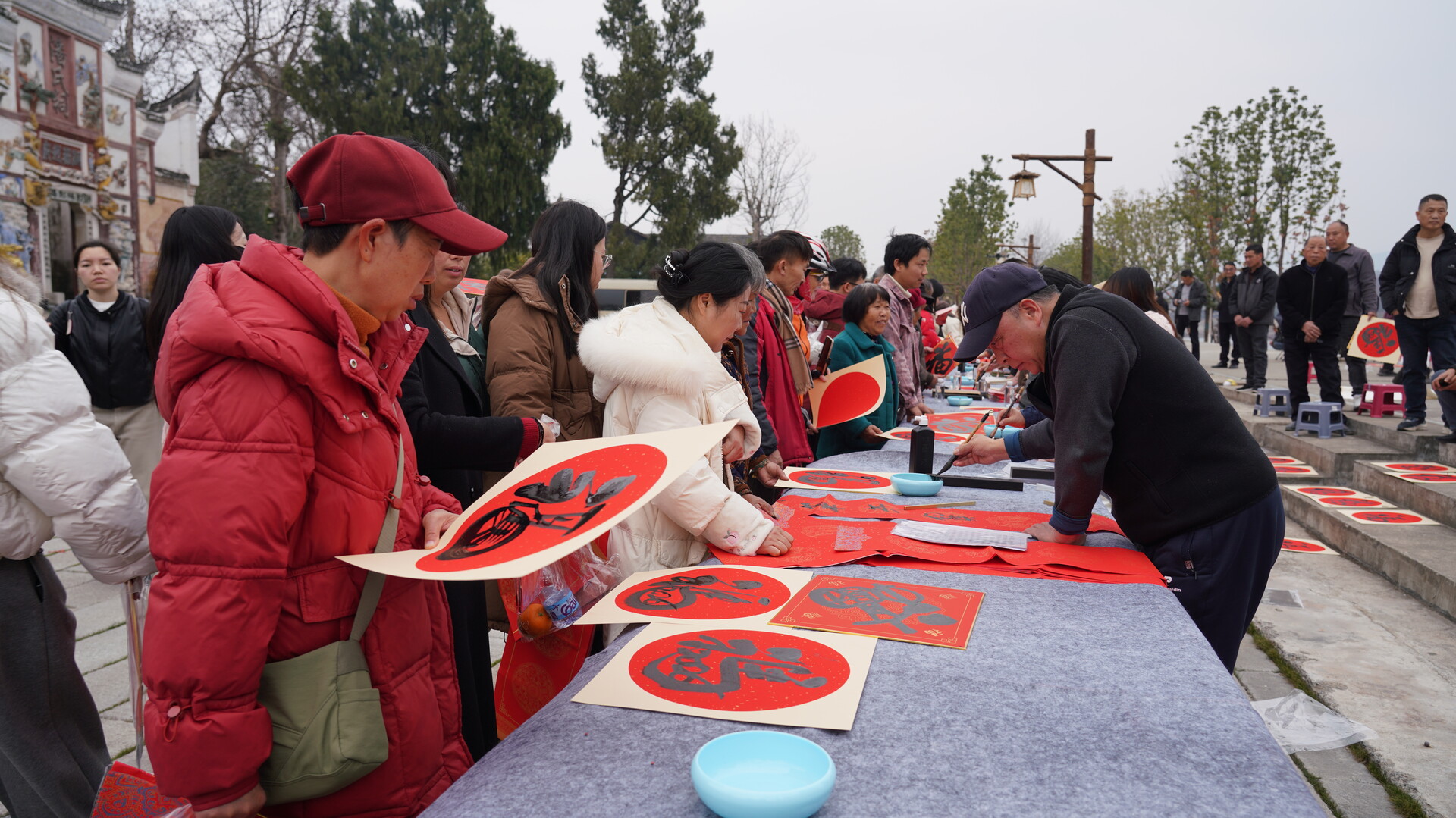 台下看戏,台边接福。与演出同步进行的,是书画名家们的现场创作。书法家们铺开红纸,挥毫泼墨,一幅幅寓意吉祥的春联、一个个饱满的“福”字墨迹未干,就被早已排队的村民们欣喜地领回家。