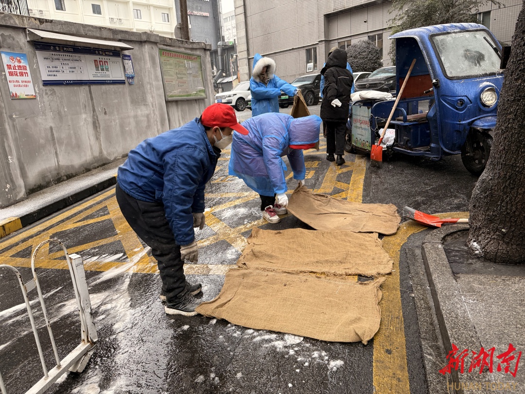 1月20日,社区在传递温暖的同时,也迅速组织工作人员和志愿者开展铲雪除冰工作。大家不畏严寒,对辖区主干道、坡道等重点位置进行清扫、撒盐、铺设麻布,全力保障居民特别是老年群体的出行安全,用切实行动守护社区的冬日安宁。