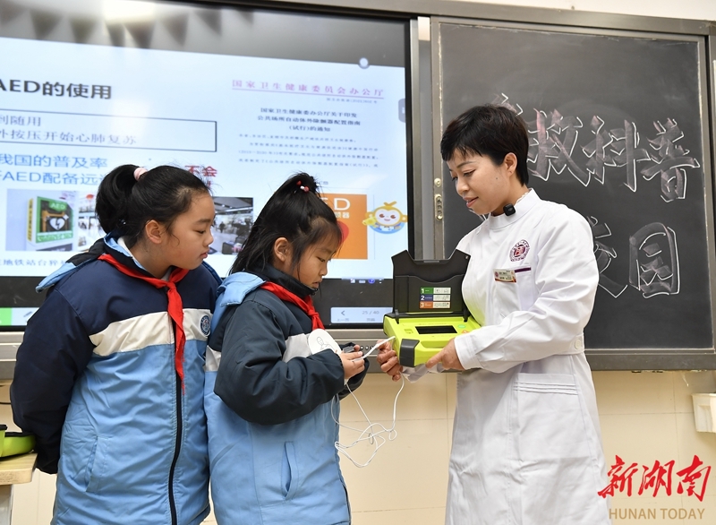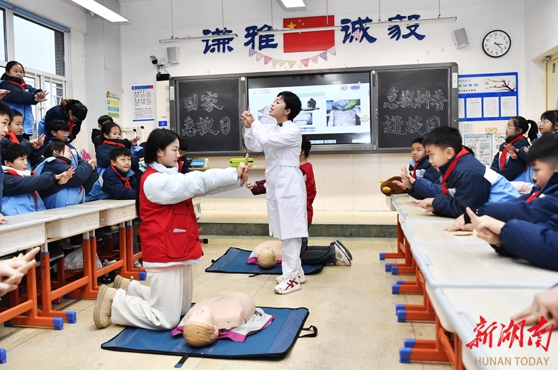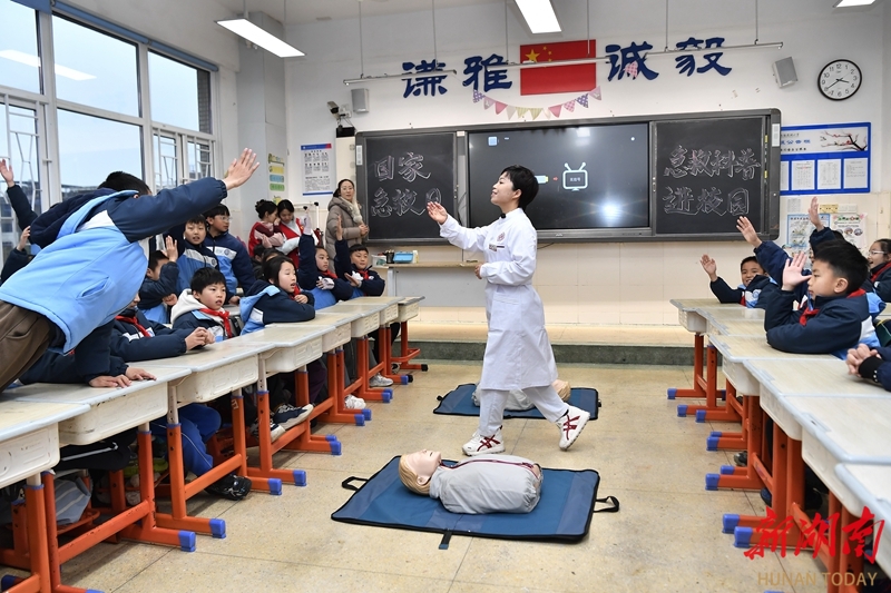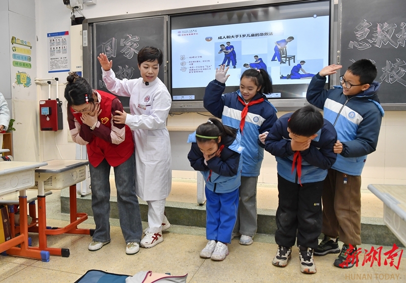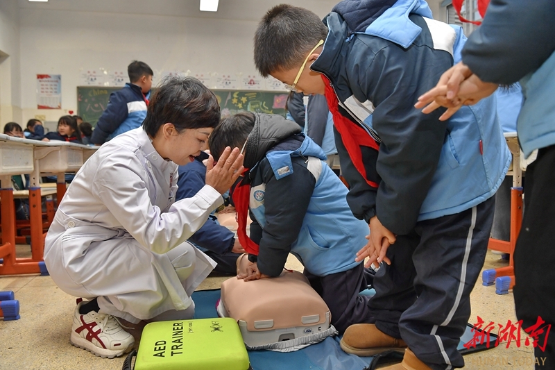 1月20日,国家急救日,由徐芙蓉党代表工作室发起并主办的“党代表工作室百场急救科普公益活动”第41场在长沙周南梅溪湖小学举行。活动以互动体验、直观示范、通俗讲解的方式,为师生们传授了心肺复苏(CPR)、AED使用、气道异物梗阻解除等关键急救技能。湖南日报全媒体记者 童迪 摄