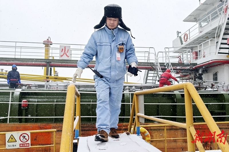 1月20日,湖南石化港口部道仁矶区员工在趸船码头冒雪巡检。入冬以来,该公司员工坚守岗位,认真落实冬季安全生产方案,各级管理及专业人员现场值班带班,切实加强雨雪冰冻灾害防范应对,确保安全清洁生产。彭展 胥征兵 摄影报道(湖南图片库)