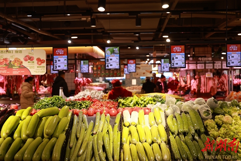 1月20日,通道侗族自治县一家超市,货架上各类新鲜蔬菜、水果、肉禽摆放得满满当当。针对近期的冰冻寒潮天气,该县积极做好居民生活必需品的供应保障,各农贸市场、超市、商场内的蔬菜、肉类、食油等物资货源充足,价格平稳。石猛雷 摄(湖南图片库)