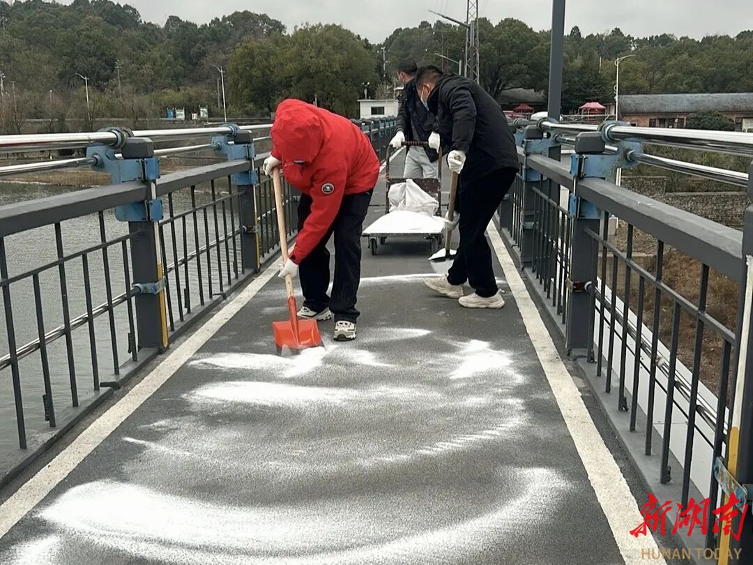 洋潭引水枢纽管理处针对大坝人行桥通行量大、易结冰的特点,一方面组织人员对桥面开展清扫作业并撒布工业盐预防结冰,安排专人24小时巡查监测,一旦发现结冰立即启动融冰除雪作业;另一方面依托2025年10月前瞻性开凿的115个桥面排水槽,实现高效排水,从根源上减少积水结冰隐患。
