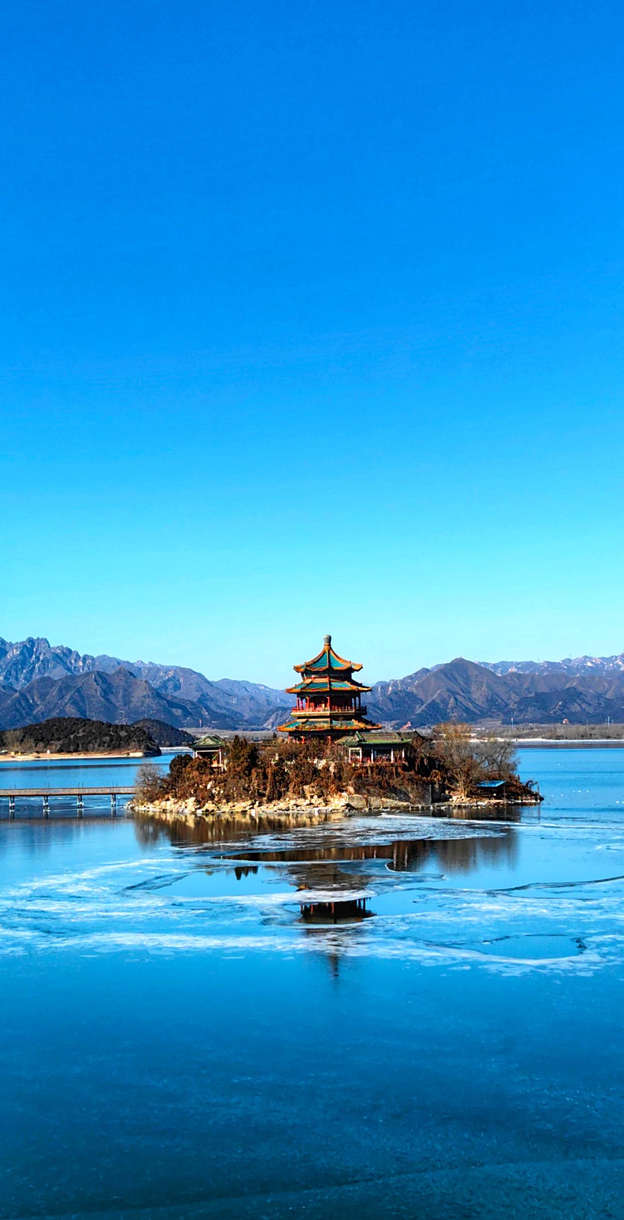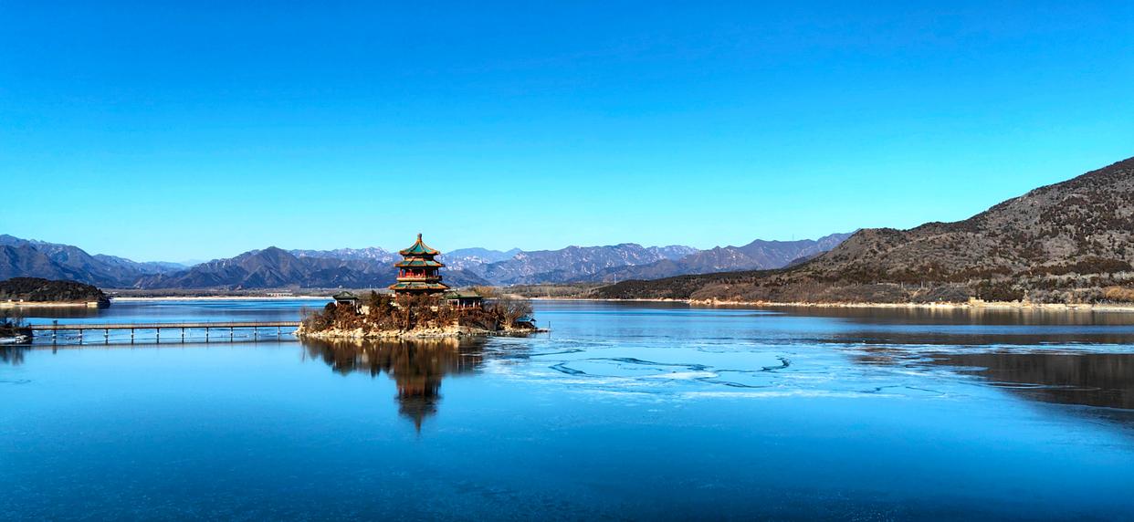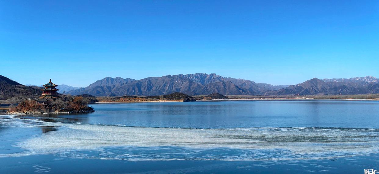 大寒刚过,朔风未歇,十三陵水库却在晴日里舒展着别样的温柔。澄澈的湖面半凝着碎冰,在蓝天映衬下泛着宝石般的蓝,湖心岛上的古建飞檐翘角,倒影在冰与水的交融里轻轻摇晃。远处层峦叠嶂,近处坝岸静谧,寒意在暖阳中渐渐消融,只剩这一湖清冽与山影相依,静候着春的脚步。