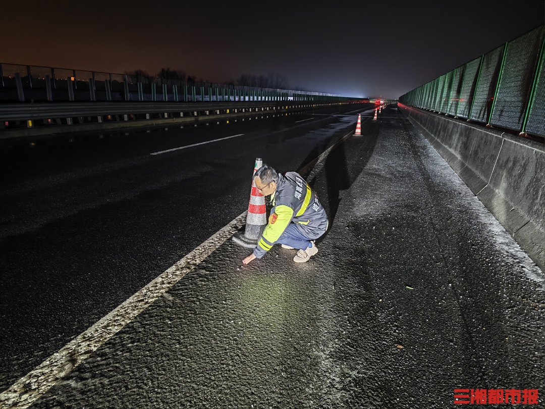 “现在体感温度低至-8℃,浏阳河大桥等路段因临水迎风成结冰高危点。”唐敏向记者透露,21日1时以后,高速公路车流逐渐减少,路面结冰隐患愈发突出。随后,他赶赴绕城高速浏阳河大桥,用测温仪精准监测桥面温度。1时40分,又紧急奔赴武深高速浏阳河大桥勘查冰情,实时反馈数据并联动养护团队。整夜往返巡查超80公里,双手冻得僵硬仍细致记录,以“3分钟响应、15分钟抵达”的速度筑牢防线,确保辖区路段无结冰拥堵,用坚守温暖司乘回家路。