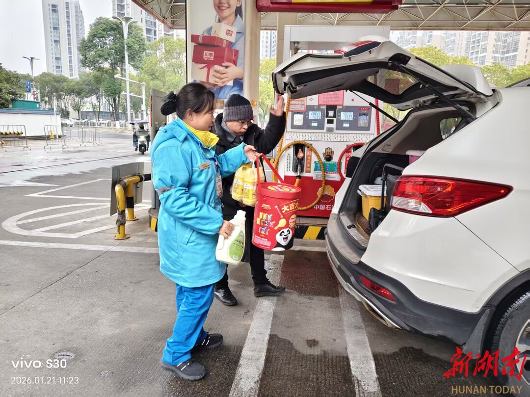 风雪一线,服务持续升温。各加油站迅速行动,站经理带领员工第一时间清扫站前道路积雪、撒布工业盐,在易滑区域增设警示牌与防滑地垫。加油员们顶着寒风高效作业,提枪加油、推介年货的同时,主动为顾客清理车辆积雪,针对柴油车结蜡问题备足抗凝剂。天湖、湘长等站通过 “司机之家” 提供休整、淋浴等服务,熙春路、赤马等站为环卫工人送上热姜茶,一句句问候、一次次援手,让加油站成为旅途温馨港湾。
