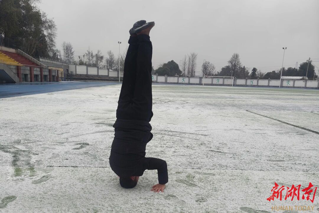“看!老师给你表演一个雪中倒立!”望城区第二中学的老师也开始炫技,只见老师两手撑地,腰部发力,在同学们的鼓掌和欢呼声中,完成了一个完美的空中倒立,在一声声快门声中,成为了这片雪地上独一无二的风景。