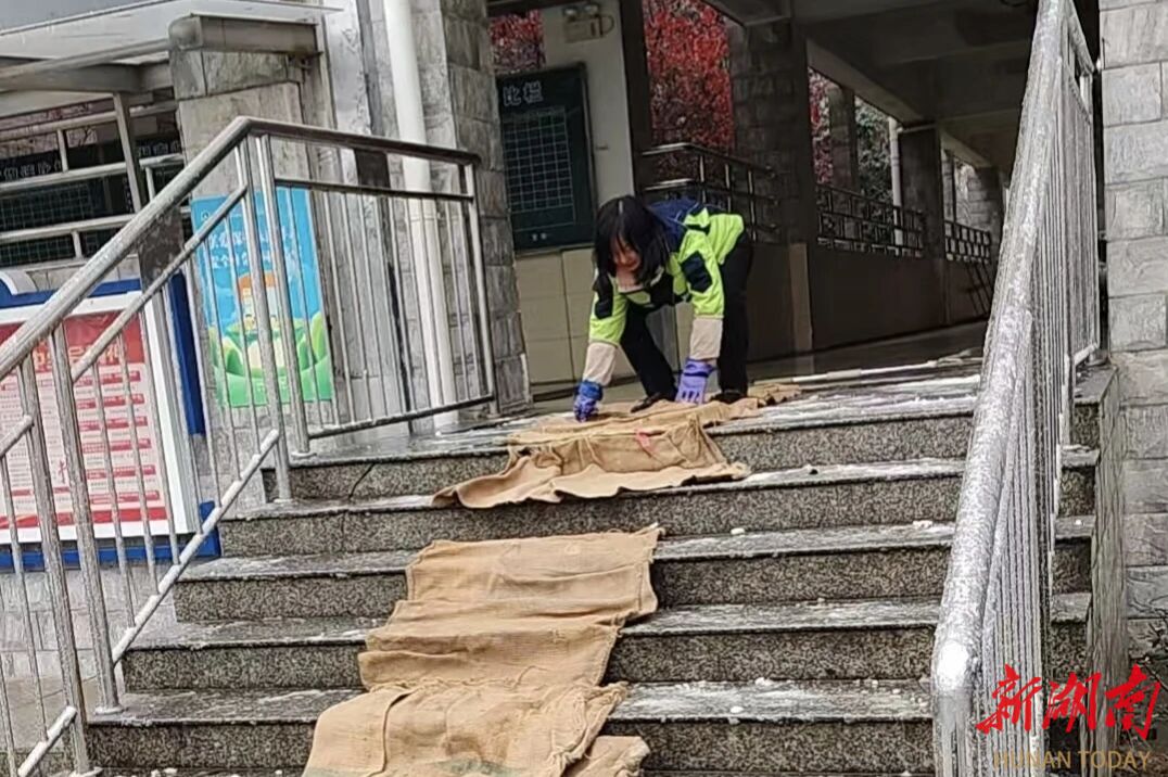 湖南师大附中星城实验第一小学早已为初雪做下准备,天还没亮,校园里的老师们、物业工作人员便开始了“硬核防护”,忙活着在路上撒盐、铺麻袋、清理通道,保障进入校园的孩子们,每一步都走得稳稳当当。在孩子们常玩的地方,后勤阿姨们也光速铺好防滑麻袋,铲除地面上易结冰的角落,扫除安全隐患,守护孩子们尽情享受下雪天。