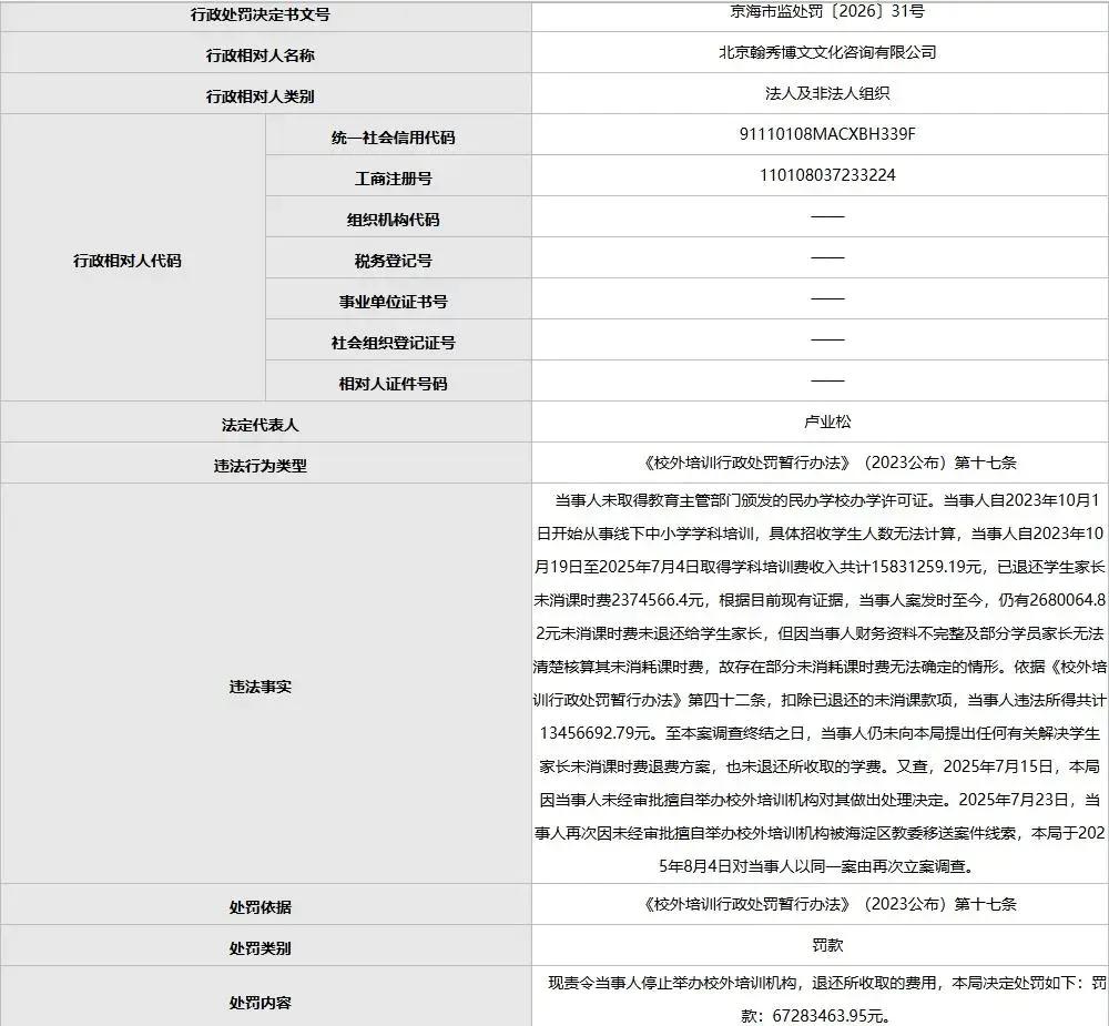 当事人因违反《校外培训行政处罚暂行办法》(2023公布)第十七条,现被责令停止举办校外培训机构,退还所收取的费用,罚款67,283,463.95元。