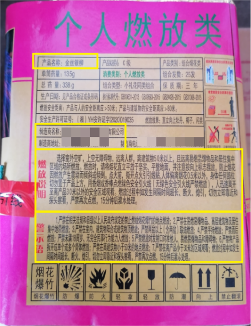 4.查看包装标识。选购包装上包含制造商名称及地址、含药量、警示语、燃放说明、生产日期、保质期、执行标准编号等基本信息的产品。