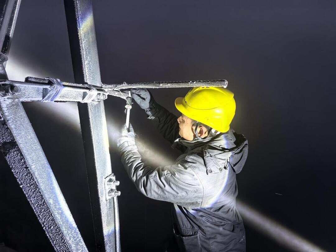 三人做好防滑措施,在强光手电的照射下,沿着冰雪覆盖的山路艰难行进。到达观测点后,他们立即用红外测温仪、风速仪等设备,仔细检查杆塔、金具、导地线的覆冰状况,清理关键部位积雪,并将数据实时回传。尽管穿着厚重的防寒装备,王小万的手指还是冻得僵硬,记录时笔尖微微发颤。班长王长虹默默接过记录本,继续完成数据登记。