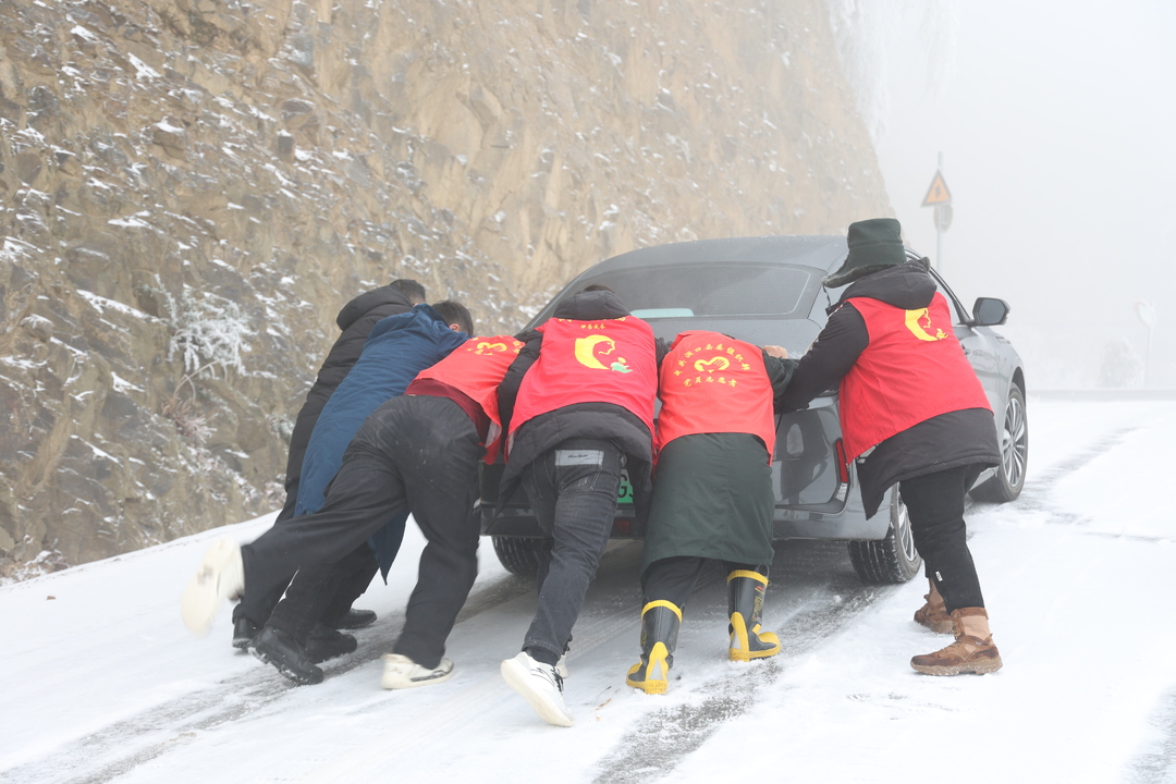 (洞口县大屋瑶族乡党员群众在通乡公路上铲雪除冰)