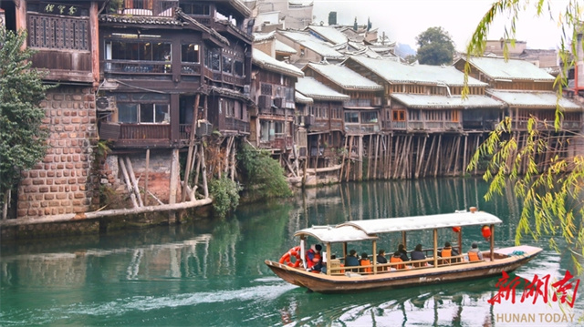 On January 21, tourists took a boat tour on the Tuojiang River to explore the snow-covered Fenghuang Ancient Town, immersing themselves in the unique riverside snowy scenery of the Miao ethnic region while experiencing the distinct winter charm of western Hunan. (Photo/Hu Xiangyu and Jiang Wenjie)