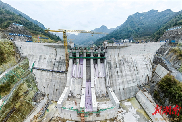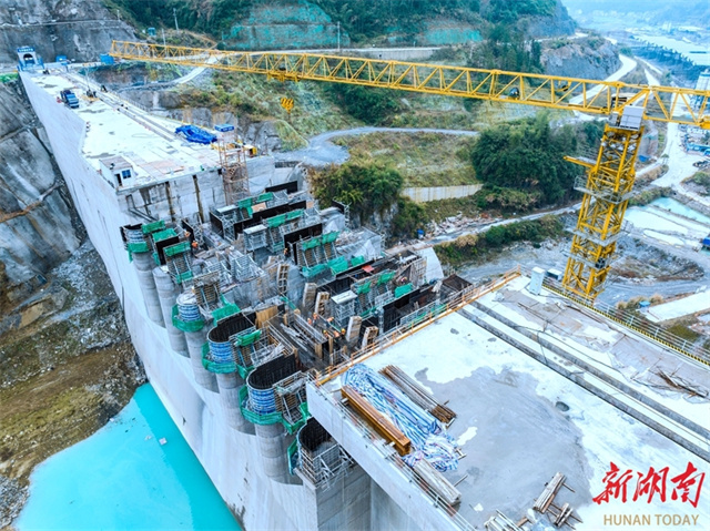On January 22, workers poured concrete at the overflow dam section of the Daxingzhai Reservoir construction site in Aizhai Town, Jishou City. In response to recent freezing weather, the construction unit has implemented insulation measures and optimized the construction schedule to ensure the project progresses as planned. It is expected that the pouring of all overflow dam sections will be completed by the end of March. (Photo/Peng Jing)