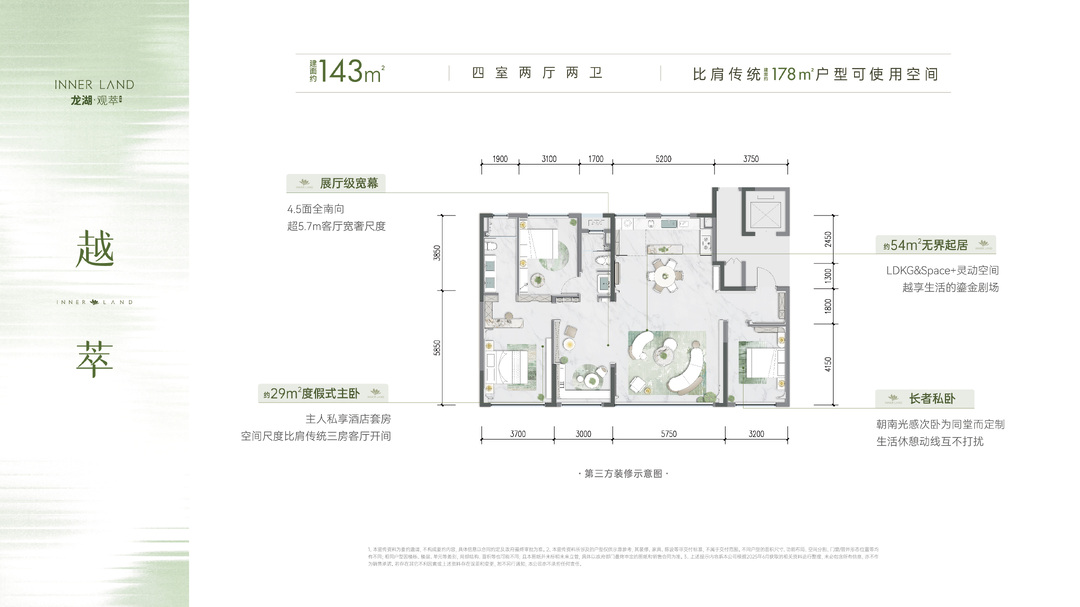 建面约143㎡全生命周期零公摊四房,通过LDKG一体化巨厅与开放式X休闲空间设计,实现比肩传统建面约178㎡户型的可使用面积。4.5面全南向布局、超5.7m客厅宽奢尺度、约54㎡无界起居空间,搭配约29㎡度假式主卧套房,既满足三口之家的舒适需求,也适配多代同堂的居住场景,生活休憩动线互不打扰。