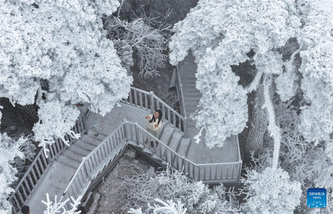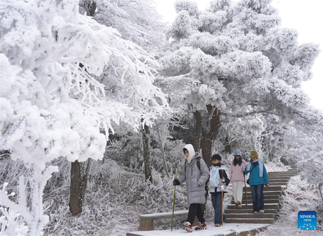 Tourists view the rime scenery at the Hengshan Mountain scenic spot in Hengyang City, central China's Hunan Province, Jan. 22, 2026. (Photo by Cao Zhengping/Xinhua)