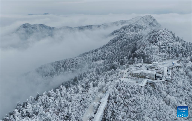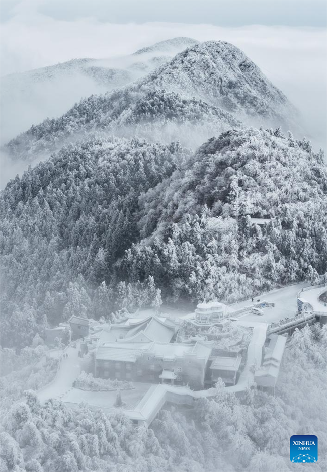 An aerial drone photo taken on Jan. 22, 2026 shows the rime scenery of the Hengshan Mountain scenic spot in Hengyang City, central China's Hunan Province. (Photo by Cao Zhengping/Xinhua)