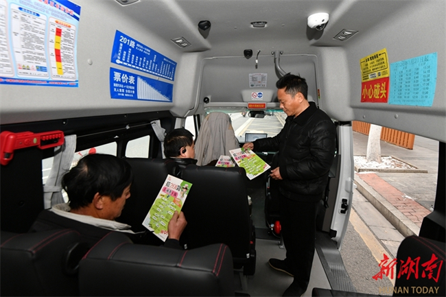 The photo, taken on January 22, shows a staff member distributing promotional materials to passengers on the Changsha-Zhuzhou-Xiangtan Intercity Bus Line 201.
