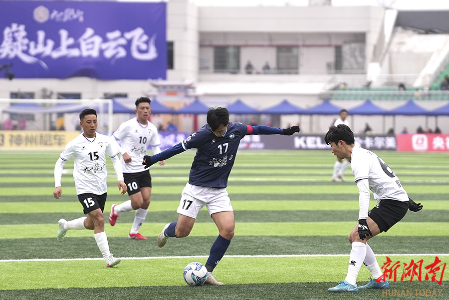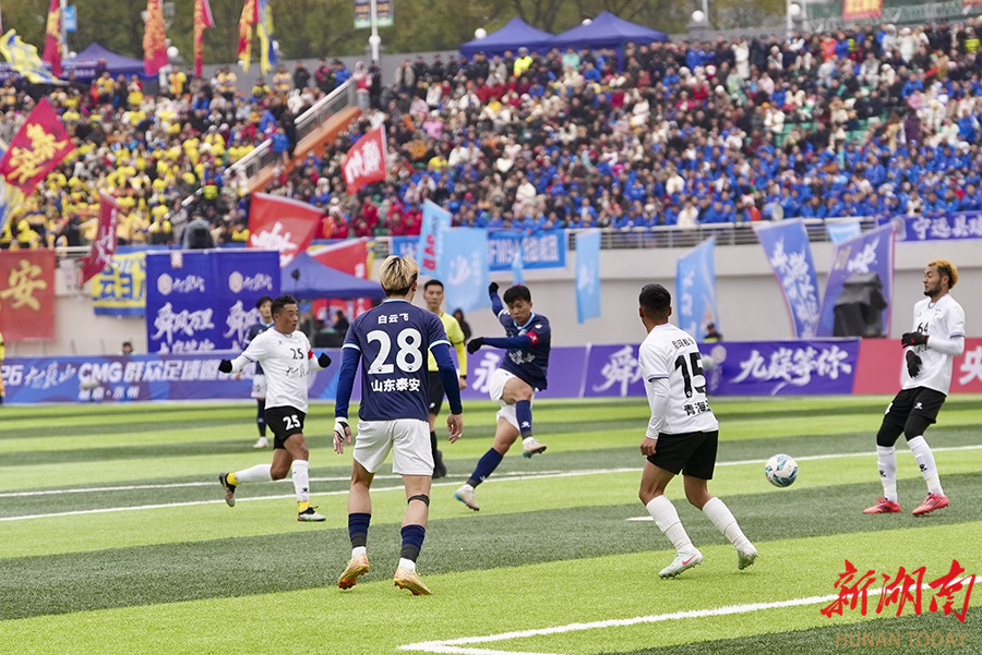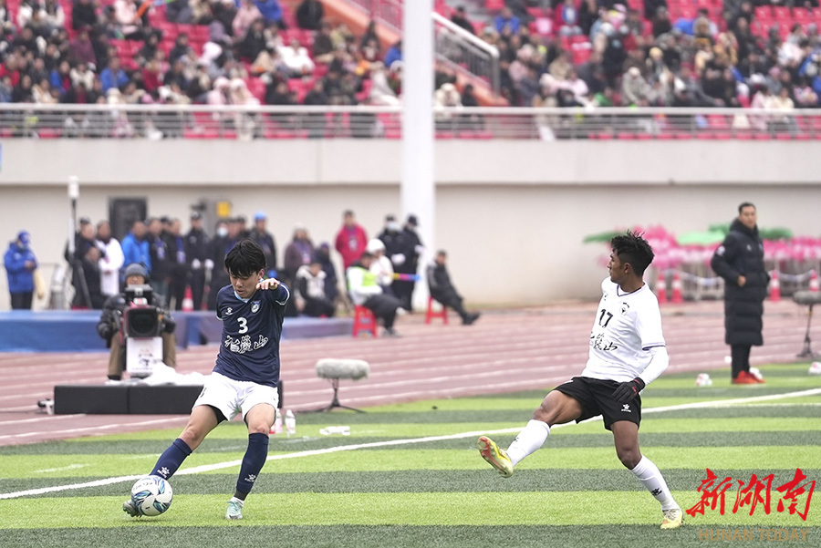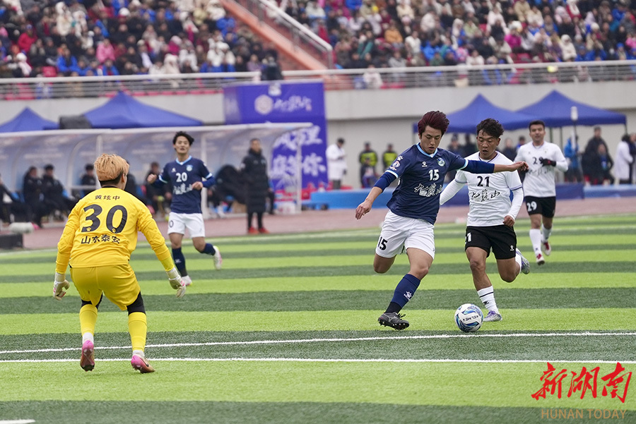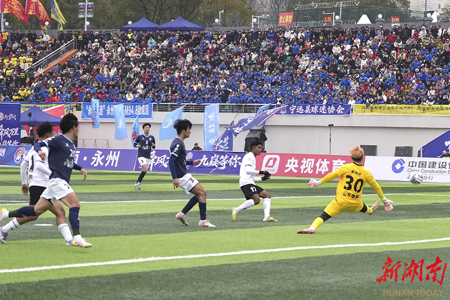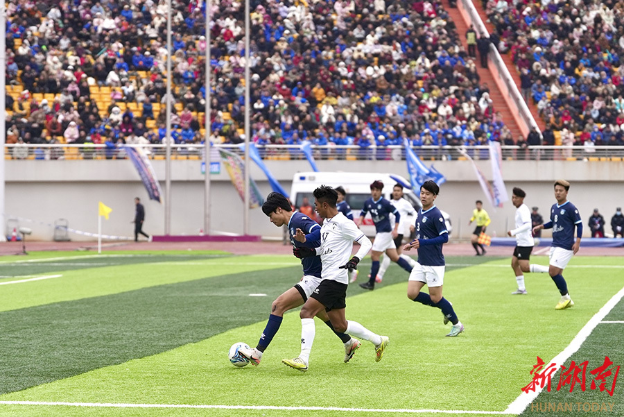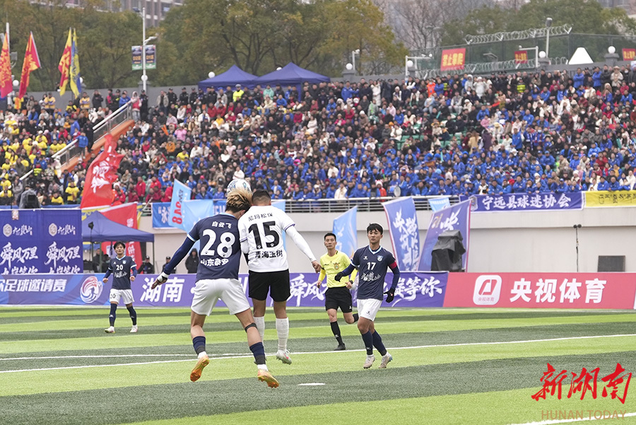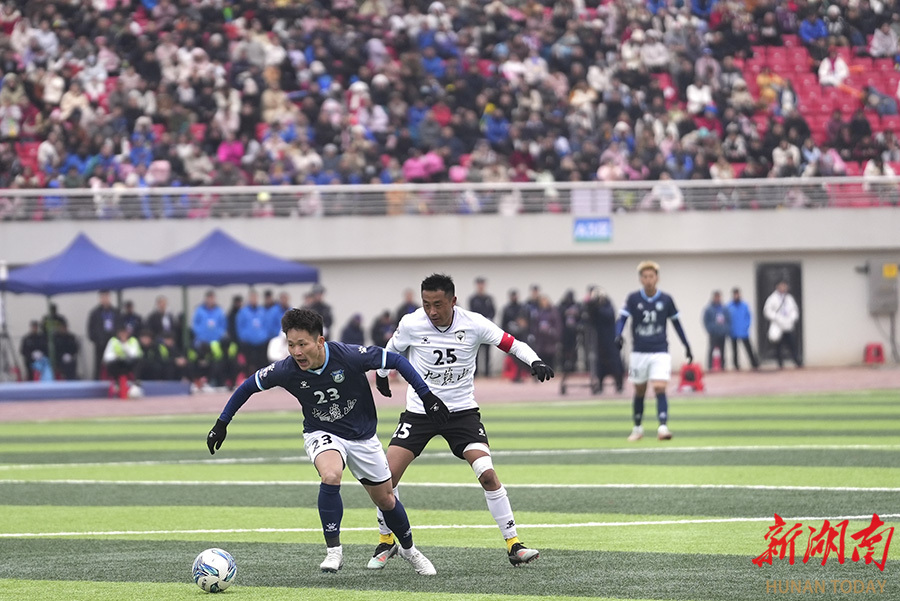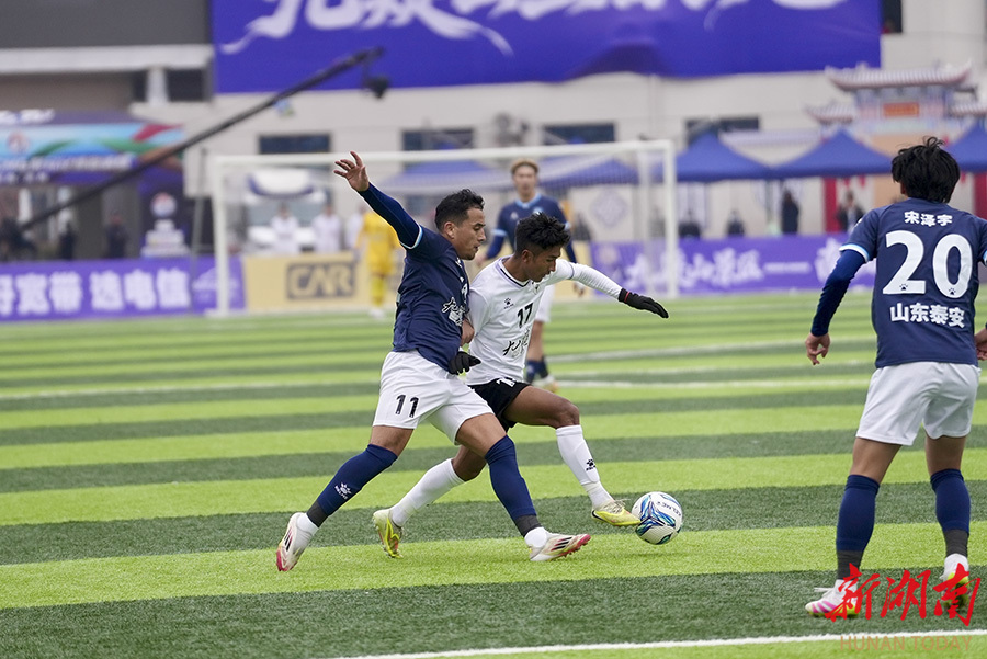 1月24日,永州市体育场,双方球员在比赛中展开激烈拼抢。当天,CMG群众足球邀请赛上演季军争夺战,最终山东泰安队以 2:1 战胜青海玉树队获得季军。 湖南日报全媒体记者 童臻熙 郭利 摄影报道