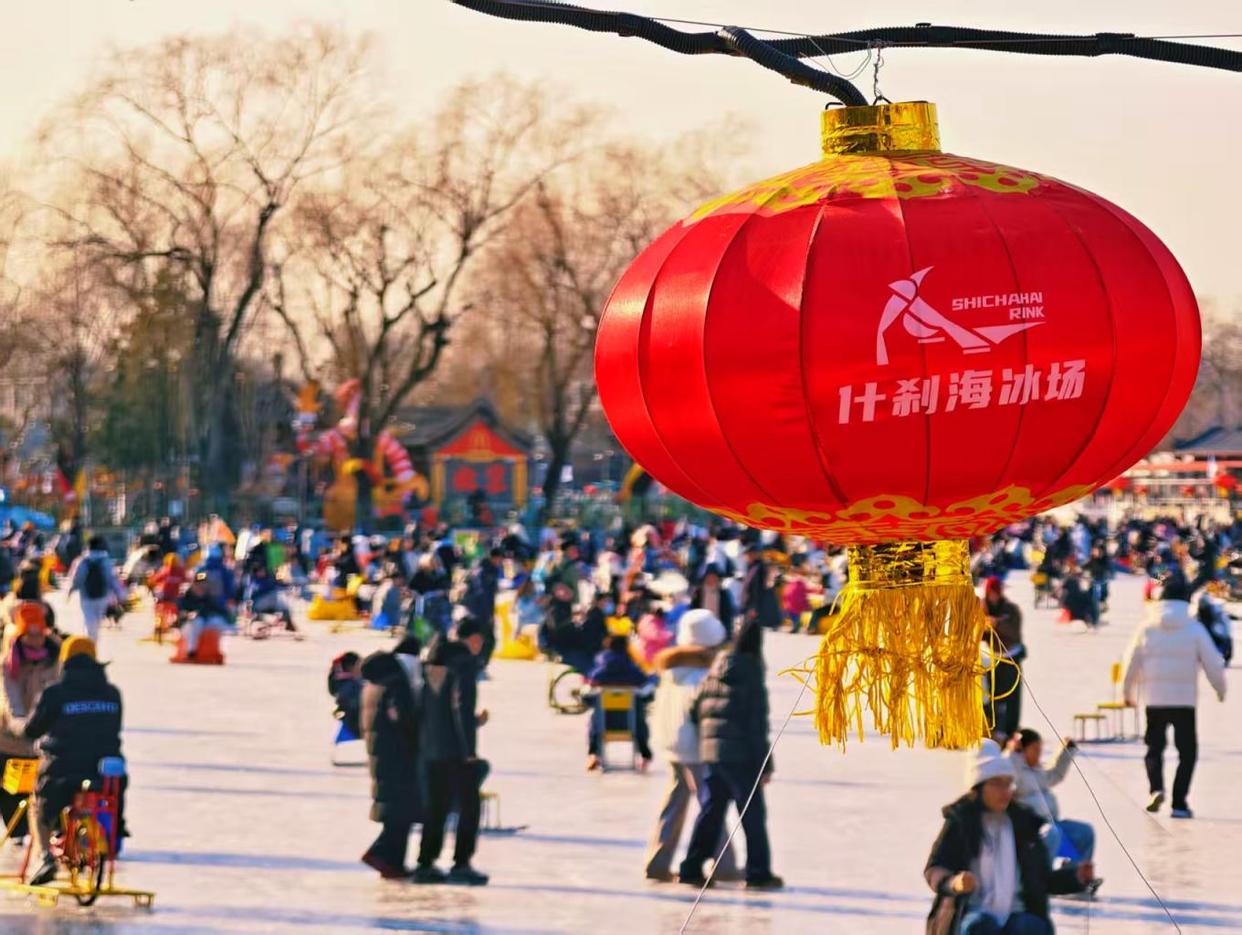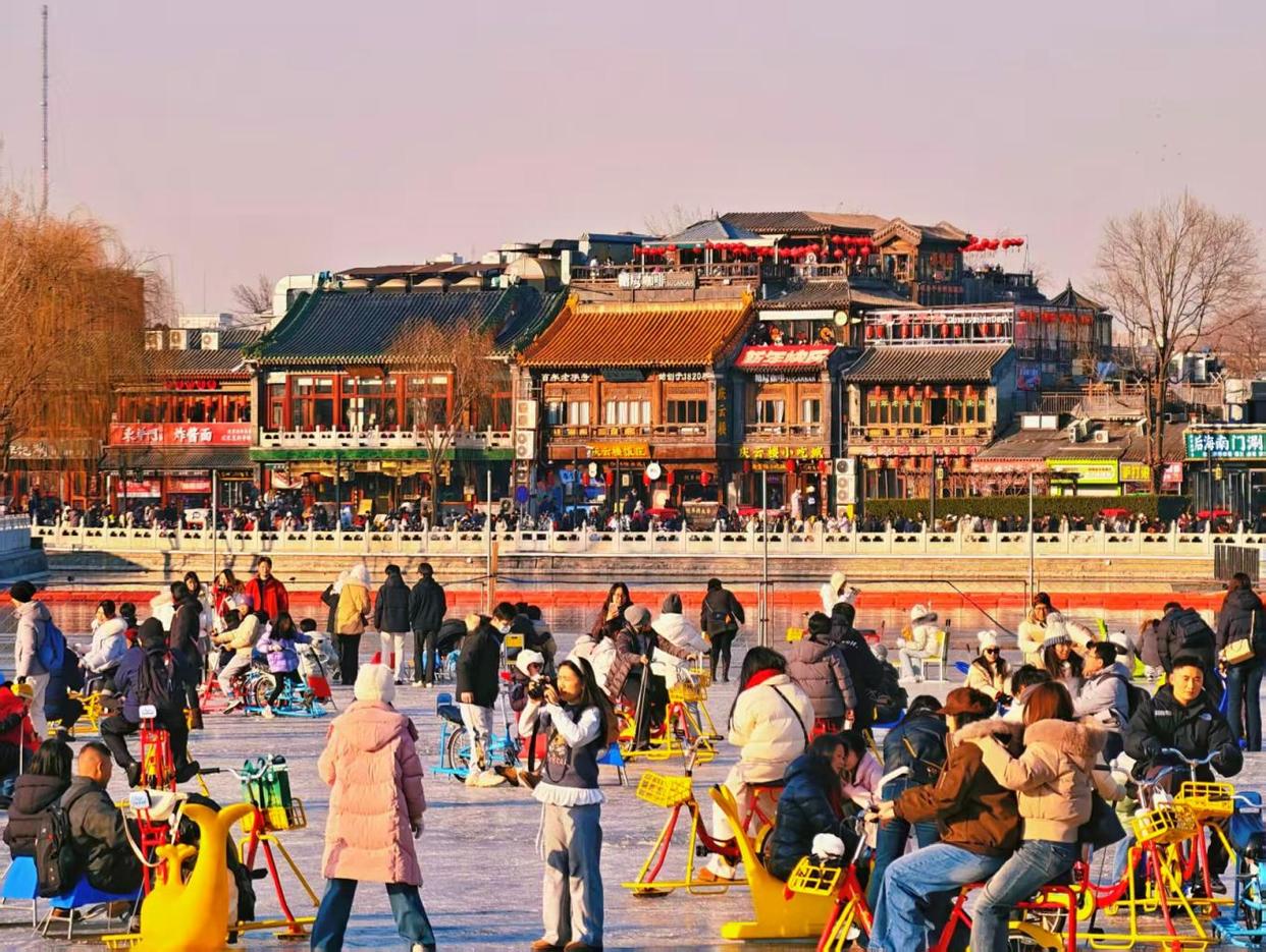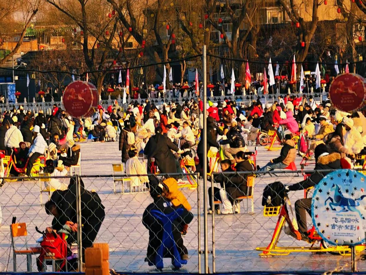 周末的什刹海冰场热闹非凡,人群如潮水般涌动,冰刀与冰车交织,欢声笑语不绝于耳,处处洋溢着冬日的欢快与活力。
