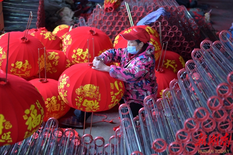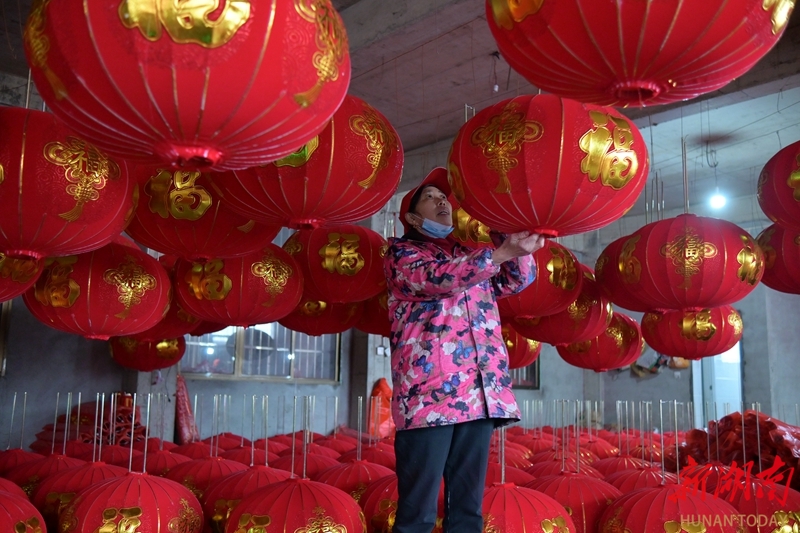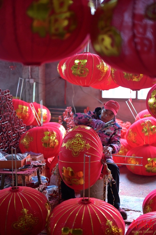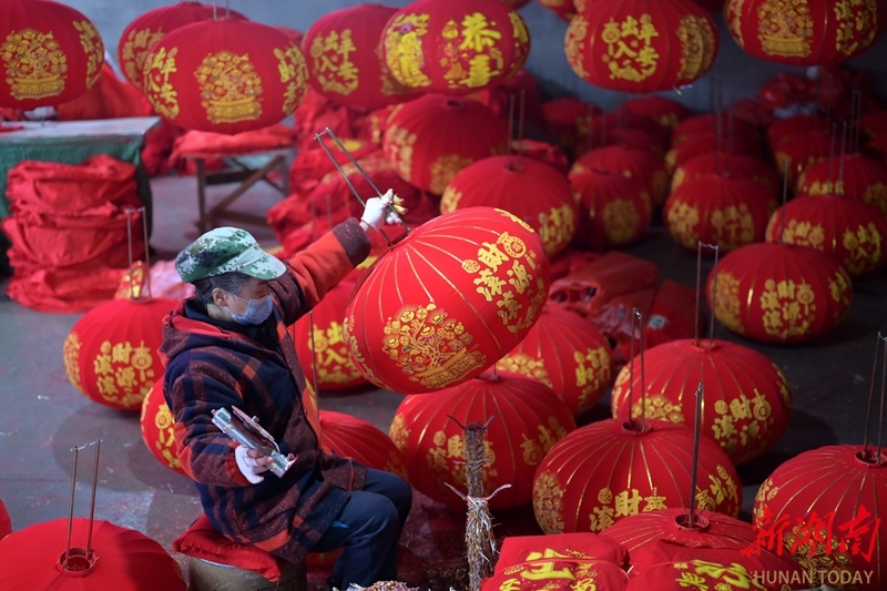 1月24日,双峰高新区湖南吉瑞风宫灯科技发展有限责任公司,工人正在悬挂制作好的红灯笼。春节临近,灯笼市场需求旺盛,当地灯笼生产企业开足马力生产,车间呈现一派繁忙景象。李建新 摄(湖南图片库)