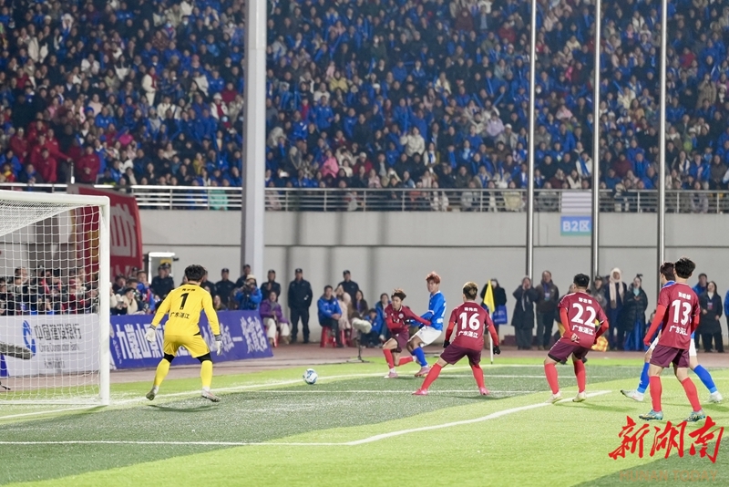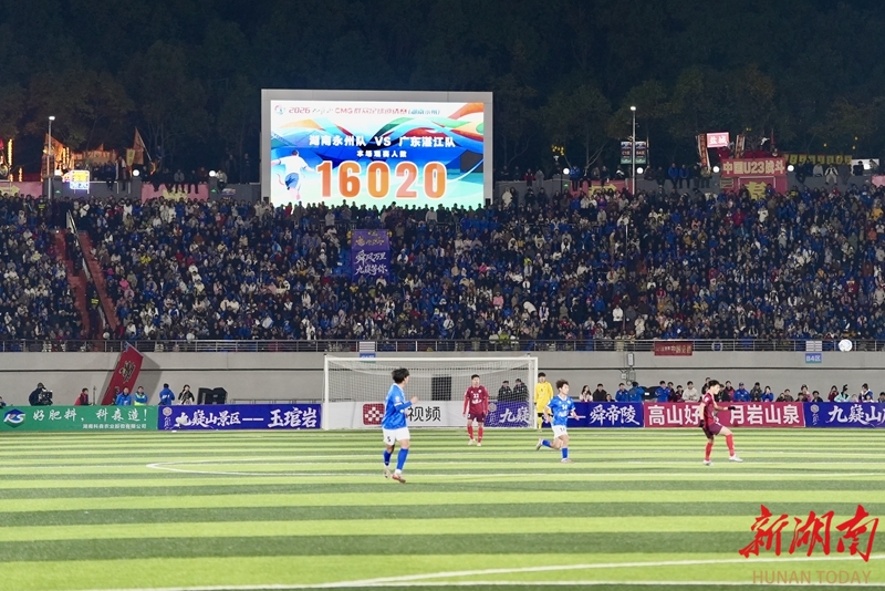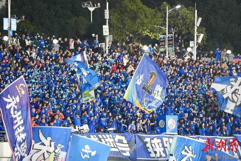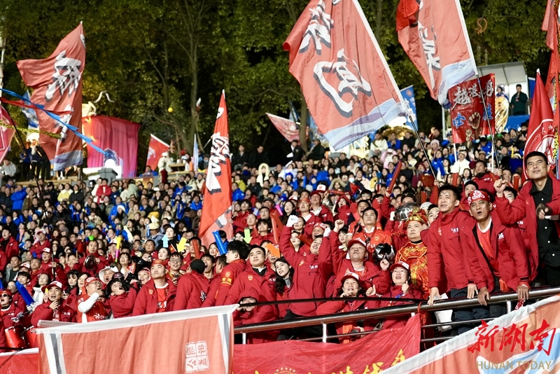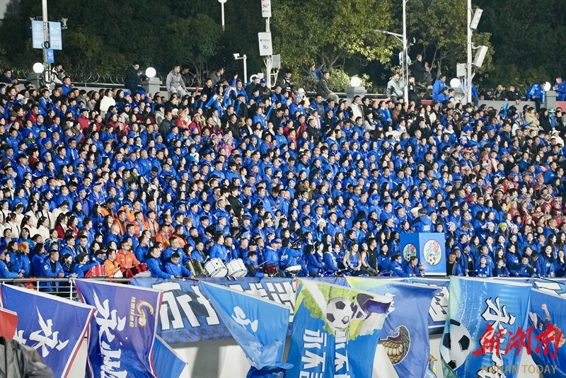 1月24日晚,永州市体育场,球迷在加油助威。当天,CMG群众足球邀请赛上演冠军争夺战,最终广东湛江队以 2比1战胜湖南永州队获得冠军。 湖南日报全媒体记者 童臻熙 郭利 摄影报道