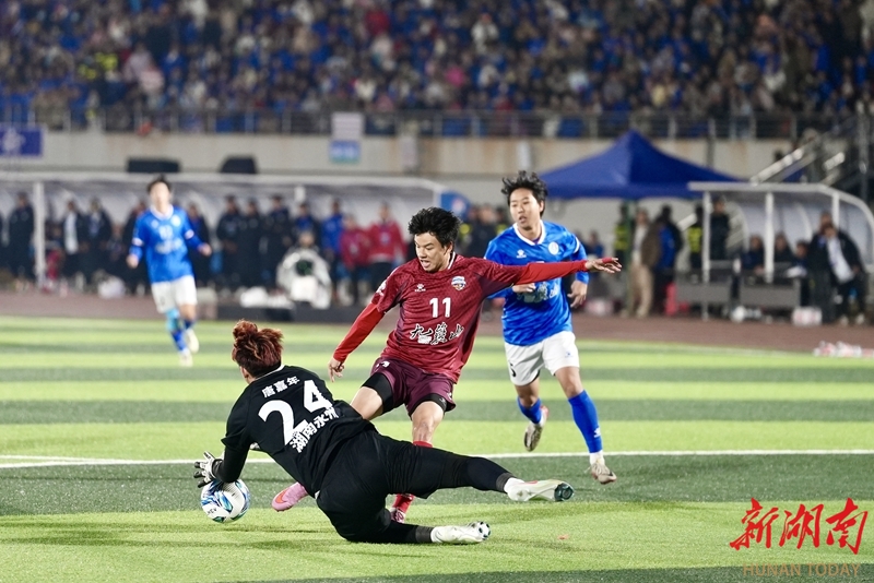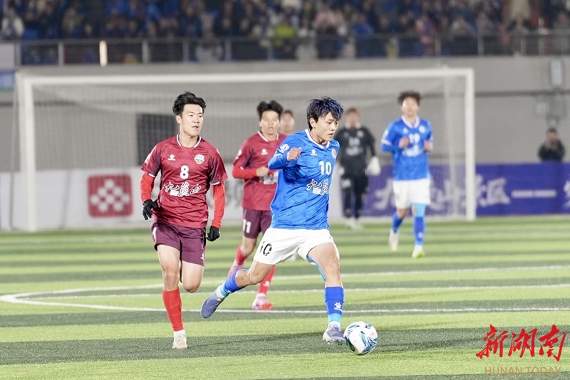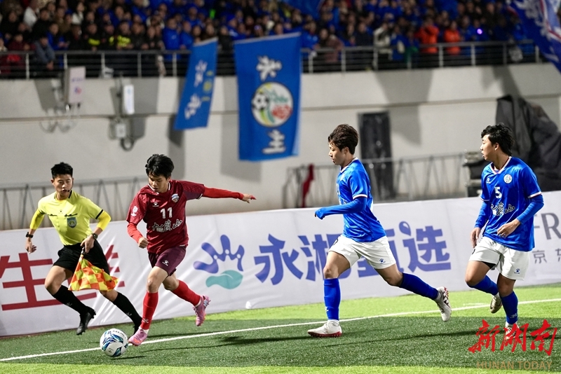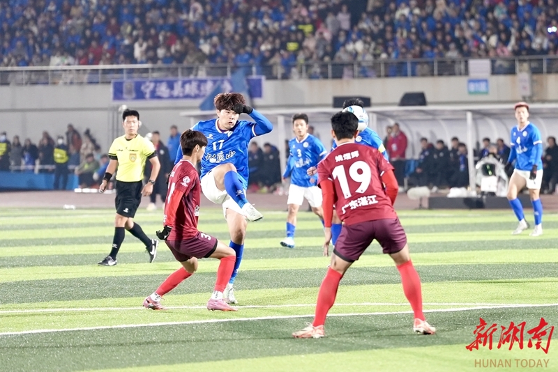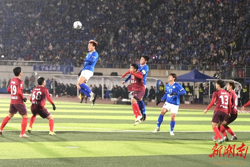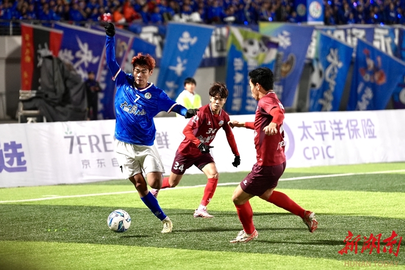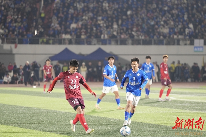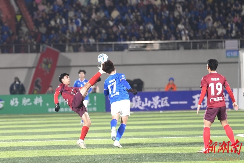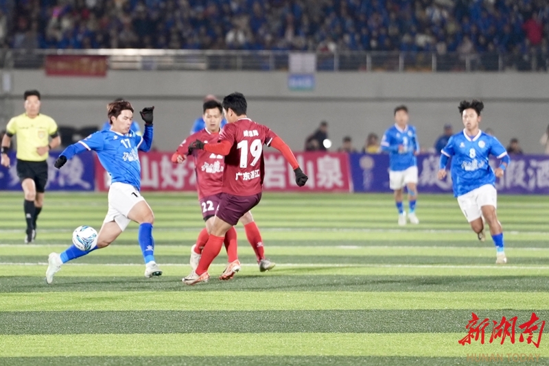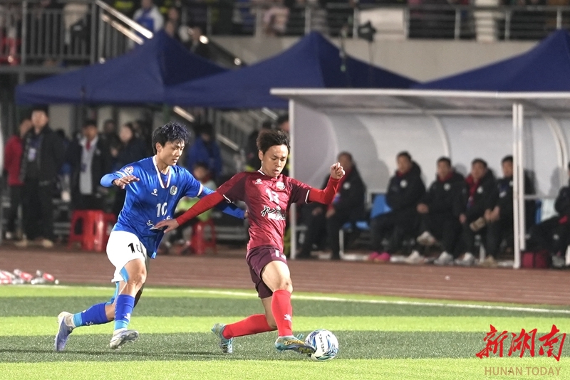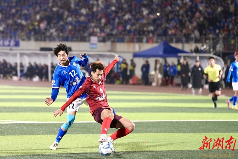 1月24日晚,永州市体育场,双方球员在比赛中展开激烈拼抢。当天,CMG群众足球邀请赛上演冠军争夺战,最终广东湛江队以 2比1战胜湖南永州队获得冠军。 湖南日报全媒体记者 童臻熙 郭利 摄影报道