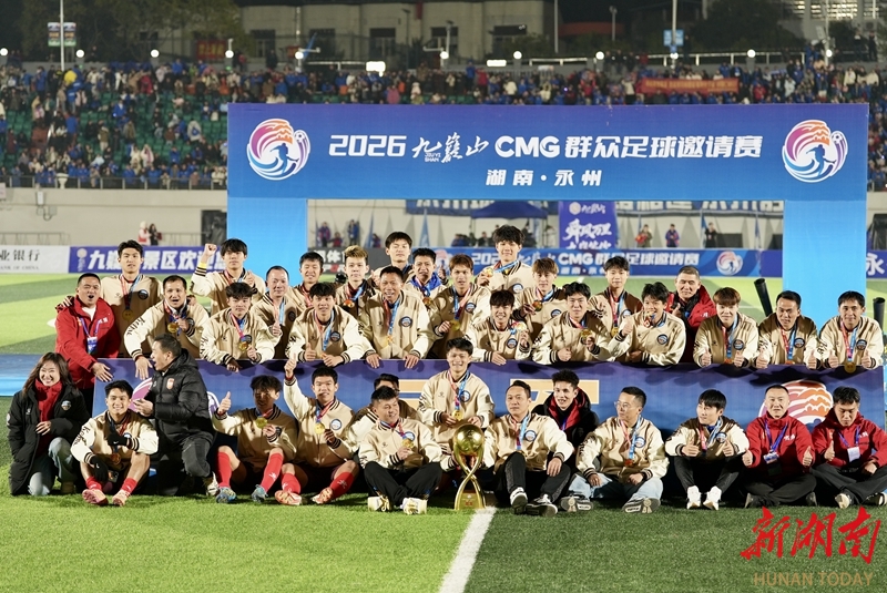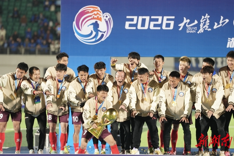 1月24日晚,永州市体育场,夺冠后,广东湛江队球员和教练在领奖台上捧起奖杯,欢呼庆祝。当天,CMG群众足球邀请赛上演冠军争夺战,最终广东湛江队以 2比1战胜湖南永州队获得冠军。 湖南日报全媒体记者 童臻熙 郭利 摄影报道