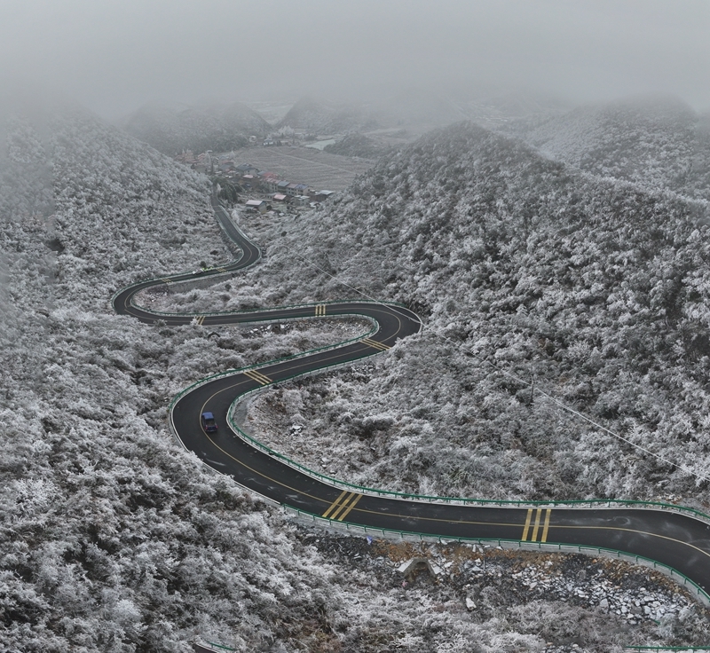 1月23日,郴州市苏仙区五盖山镇,雪后五盖山康养旅游公路沿线银装素裹,与山川田野构成一幅幅水墨画卷,美不胜收。黄建华 摄(湖南图片库)