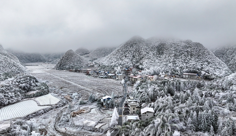 1月23日,郴州市苏仙区五盖山镇凉伞坪村,雪后村落银装素裹,与山川田野构成一幅幅水墨画卷,美不胜收。黄建华 摄(湖南图片库)