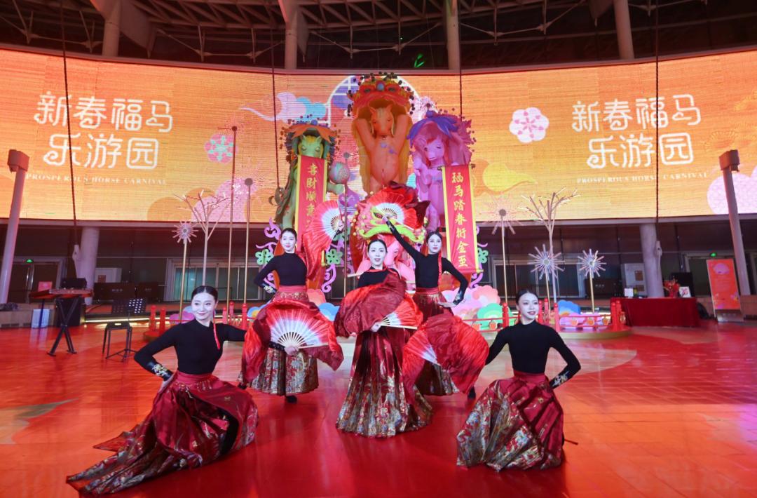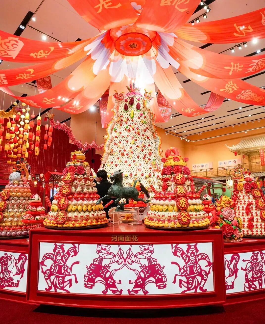 在“骥跃鸿途”展区,以马为主题的剪纸、年画、皮影、陶瓷、石雕、皮雕、竹编、泥塑等多种传统技艺类非遗作品纷纷亮相。在“食为天”展区,一座高4.5米、直径3.6米的花馍“大鼓枣山”引来观众驻足惊叹。“光转春辉”展区选取近百件节日主题非遗灯彩作品,用造型丰富、制作精美的灯彩营造万家欢乐的节日氛围空间。