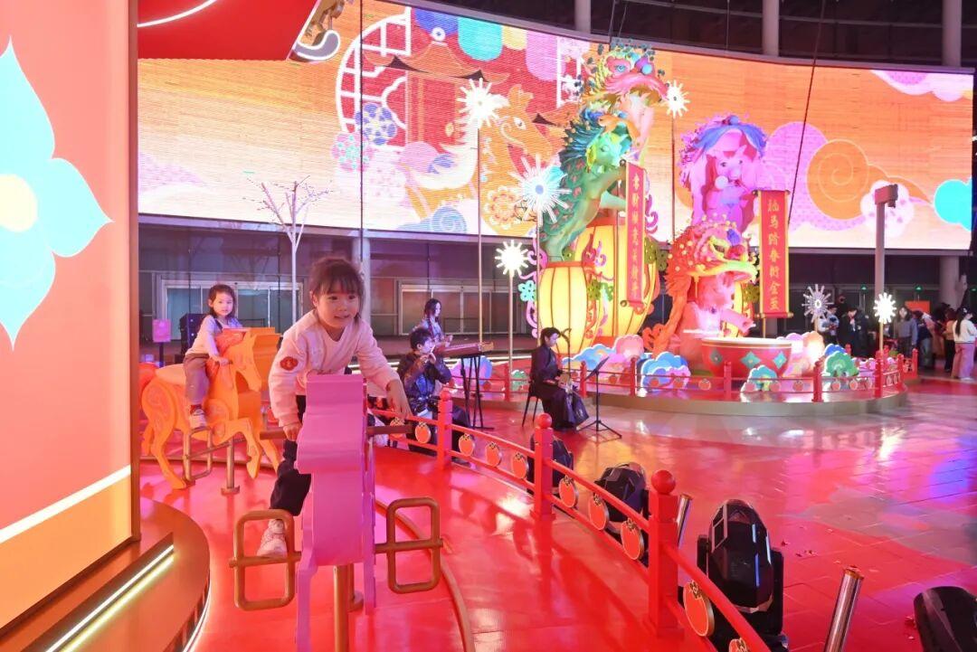 市民游客还能解锁多重趣味互动。登上“福马转转乐”,在精密齿轮的转动韵律与流动光影间缓缓旋转;行至黄金树下,在璀璨枝叶间虔诚许下来年心愿;走进“行运小镇”,可亲身参与“一马当先”竞速装置等项目。