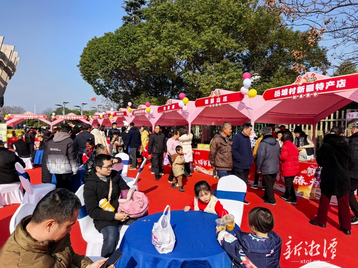 集市现场划分为多个特色区域:年货专区汇集各类新春好物,从传统装饰到创意礼品一应俱全,大家不用奔波就能一站式备齐新年所需;美食区香气四溢,腊味、烧烤、草莓、甜品、饮品、新疆特产等琳琅满目,可满足不同人的味蕾;本地优质农产品专区则展示了青山云雾茶、湘莲、百合等岳塘优质好物,被市民称赞为“岳塘宝藏库”;非遗展示自然也少不了,岳塘本土农产品的天然纯粹与非遗手作的独特韵味相互映衬,充分彰显了地方文化底蕴。消费品以旧换新、家政服务咨询等惠民专区也引来不少市民驻足。