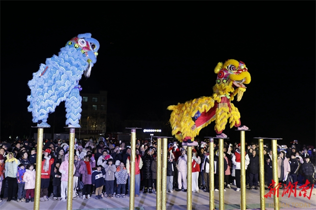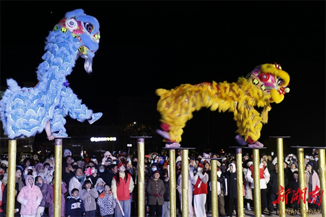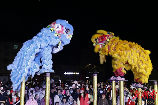 Villagers watch lion dance performance in Shuijingwo Village, Longquan Neighborhood, Xintian County on the evening of January 21. A folk culture exchange event was held in the village on that day. A variety of activities were held, such as lion dance, fish-catching, and making ciba using traditional methods. Many villagers were attracted, greeting the upcoming Chinese New Year together in a strong festive atmosphere. (Photo/Zhong Weifeng)