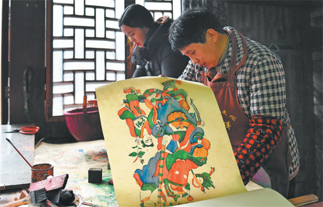 Yin Dongxiang (right) and her daughter Xiao Yang print a New Year painting depicting menshen, or door gods, on Dec 24, in Tantou, Shaoyang, Hunan province. CHEN ZHENHAI/XINHUA