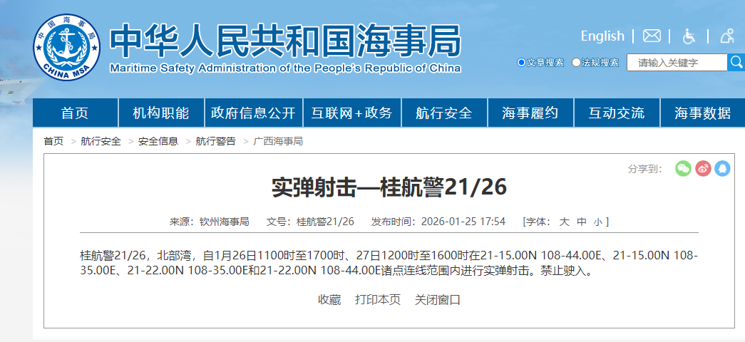 据中国海事局网站消息,钦州海事局发布航行警告,1月26日11时至17时、27日12时至16时,北部湾部分海域进行实弹射击,禁止驶入。
