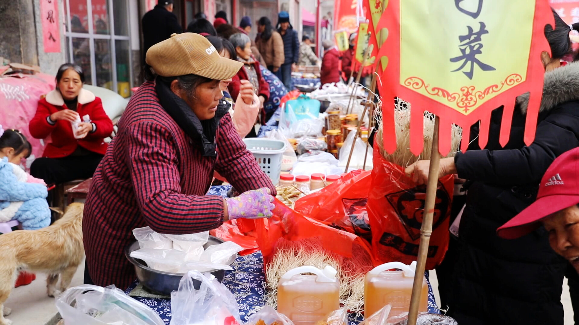 新鲜宰杀的牛羊肉、黑猪肉,土鸡鸭、腊肉、塘鱼等各种“土味”十足的年货琳琅满目,各个摊位前游客络绎不绝,大家沉浸式体验最具烟火气的集市,尽情挑选购置各类土特产。