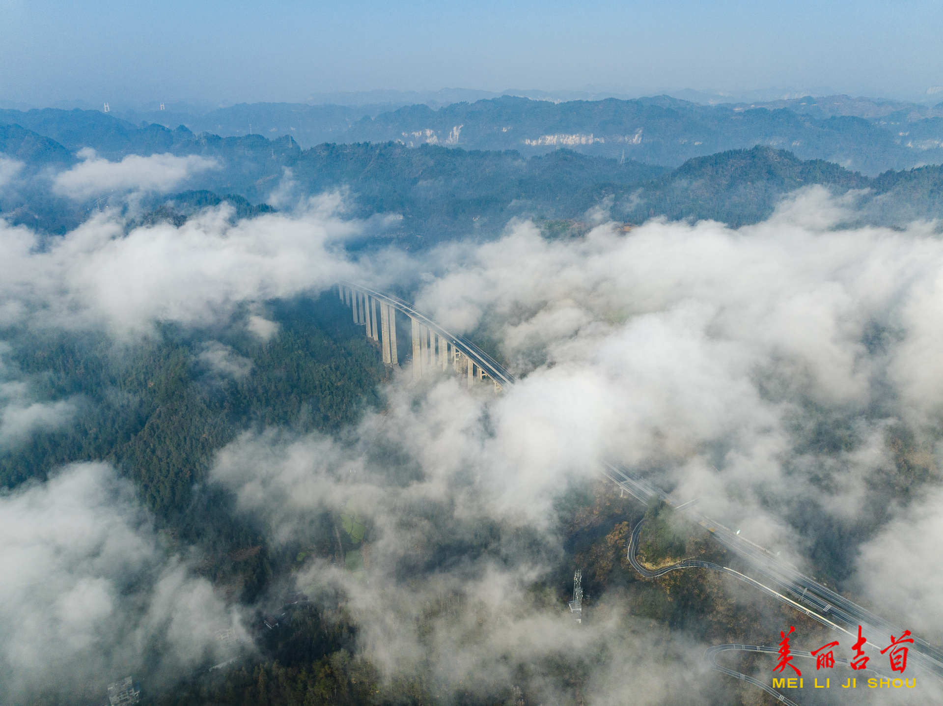 近日,吉首市石家寨高速公路互通立交桥附近云雾缭绕,路桥、村庄、河流在冬日晨雾中时隐时现,宛如一幅天然水墨画卷。