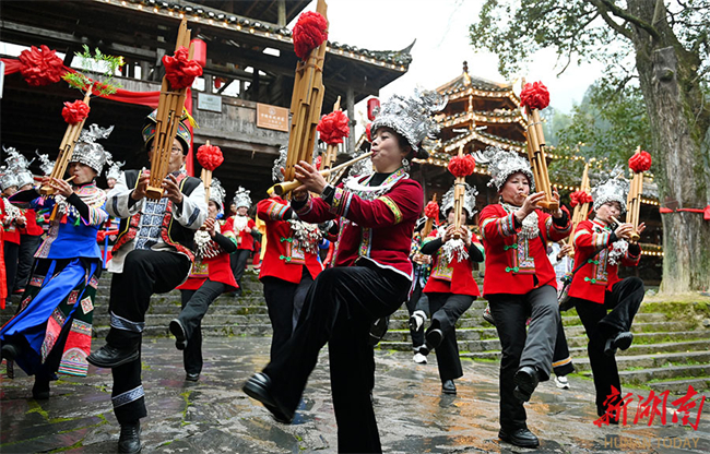 Villagers dressed in festive attire play the Lusheng, a traditional reed-pipe wind instrument, at Shangbao Dong Village, Zhaishi Miao and Dong Township, Suining County on January 25.A folk celebration for the upcoming Chinese New Year was held on that day. Local Dong people and visitors enjoyed various folk activities together, such as making ciba, a round-shaped glutinous rice cake, and appreciating oil tea, a traditional drink for people of the Dong ethnic group, immersing themselves in an intense festive atmosphere. (Photo/Teng Zhizhong and Huang Kailong)