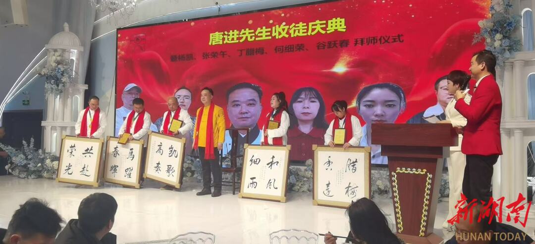 当晚的高潮是庄严而温馨的拜师典礼。在众人见证下,龙牌味业湘南地区经理杨凯、华郴米业及天天粮油总经理张荣午、邓哈哈鲜活集市执行董事何细荣、胖婆捆鸭非遗技艺传承人谷跃春、港顺食品郴州区域经理丁腊梅等五位优秀青年才俊,依循古礼,依次向恩师唐进宣读拜师帖、行鞠躬礼、敬拜师茶。唐进欣然接纳,并向新弟子回赠纪念章、弟子顺序牌、红巾及亲手书写的墨宝,正式确立师徒名分,完成了薪火相传的庄严承诺。现场掌声雷动,共同恭贺唐进再得高徒,唐门枝繁叶茂。