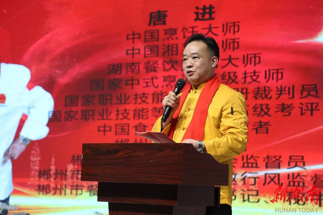 中国烹饪大师、湘菜大师、郴州市餐饮商会党支部书记兼秘书长唐进在致辞中,深情表达了对技艺传承的坚守、对弟子成长的欣慰以及对湘菜行业未来发展的殷切期望,其真挚的师者情怀令在场众人动容。