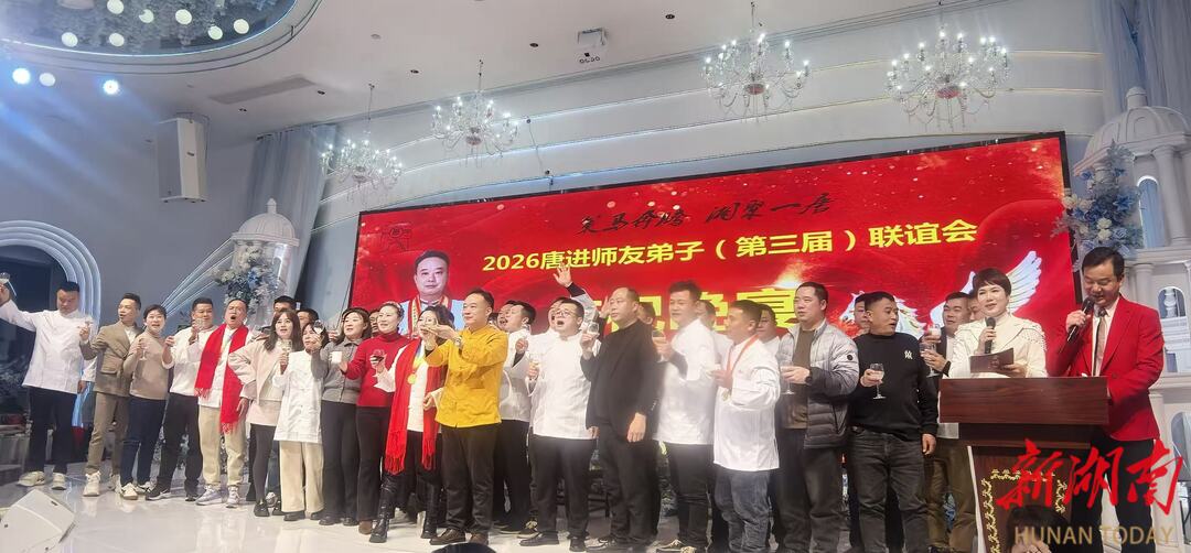 1月28日晚,郴州喜上喜大酒店内灯火辉煌,高朋满座,洋溢着喜庆与温馨的氛围。“2026唐进师友弟子(第三届)联谊会暨杨凯、张荣午、何细荣、谷跃春、丁腊梅拜师庆典”在此隆重举行。本次活动汇聚了郴州市相关领导、餐饮行业协会代表、烹饪大师、食材厂商代表、文化界人士以及唐进师友弟子们,共同见证了一场融合尊师重道、技艺传承与行业交流的盛会。