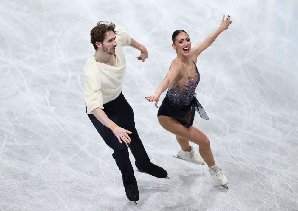 2025年12月5日,意大利组合孔蒂(右)/马奇在双人滑自由滑比赛中。当日,2025-2026赛季国际滑联世界花样滑冰大奖赛总决赛双人滑比赛在日本爱知县名古屋举行。最终,他们以223.28分的成绩获得双人滑银牌。新华社记者 岳晨星 摄