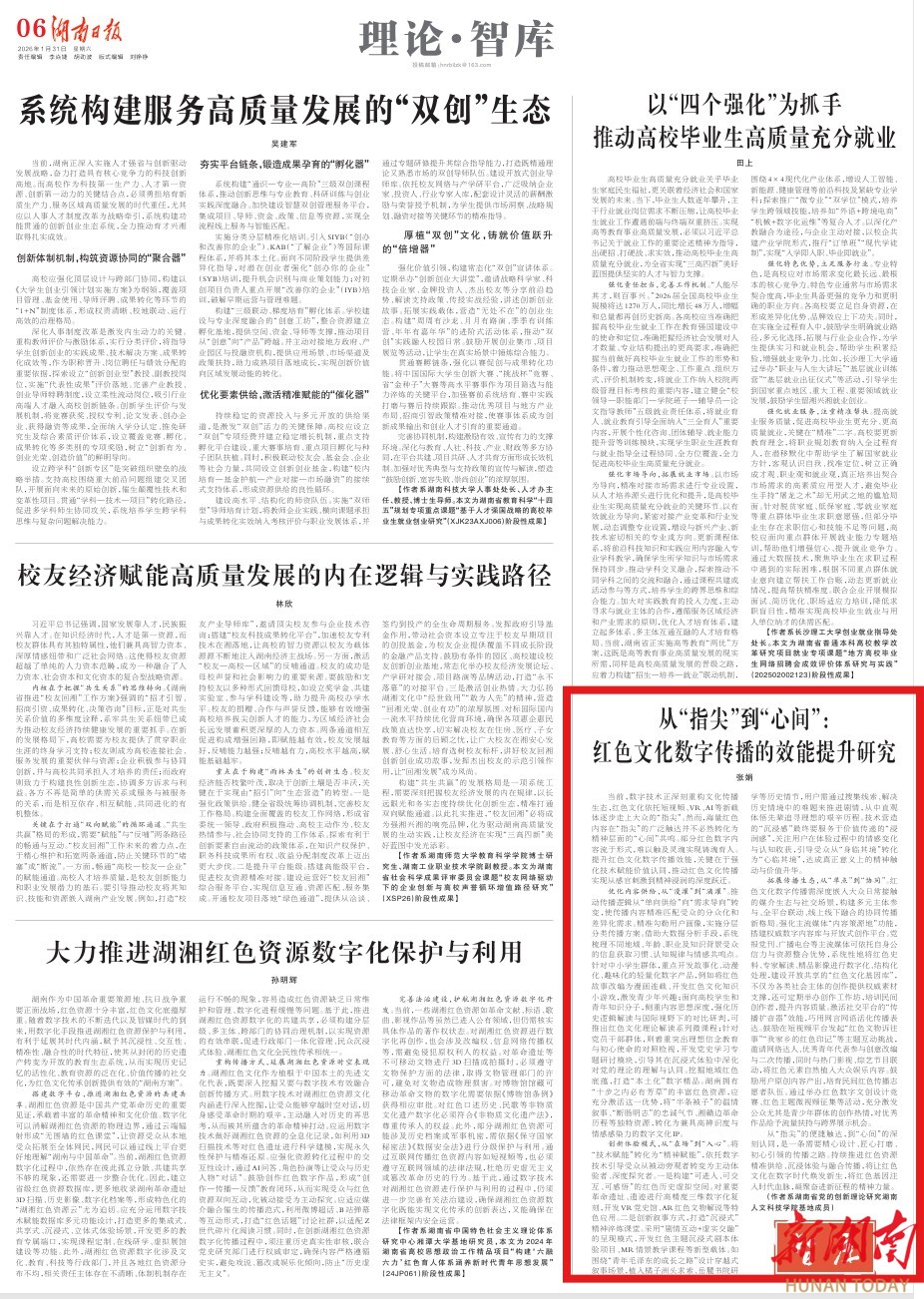 优化内容供给,从“漫灌”到“滴灌”。推动传播逻辑从“单向供给”向“需求导向”转变,使传播内容精准匹配受众的分众化和差异化需求。精准勾勒用户画像,实施分层分类传播方案。借助大数据分析手段,系统梳理不同地域、年龄、职业及知识背景受众的信息获取习惯、认知规律与情感共鸣点。针对中小学生群体,重点开发故事化、动漫化、趣味化的轻量化数字产品,例如将红色故事改编为漫画连载、开发红色文化知识小游戏,激发青少年兴趣;面向高校学生和青年知识分子,侧重内容思想深度,强化历史逻辑解读与国际视野下的对比研判,可推出红色文化理论解读系列微课程;针对党员干部群体,则着重突出理想信念教育与初心使命的对照检视,开发党史学习专题研讨模块,引导其在沉浸式体验中深化对党的理论的理解与认同。挖掘地域红色底蕴,打造“本土化”数字精品。湖南拥有“十步之内必有芳草”的丰富红色资源,应充分激活这一优势,将“半条被子”的温情叙事、“断肠明志”的忠诚气节、湘赣边革命历程等独特资源,转化为兼具高辨识度与情感感染力的数字文化IP。
