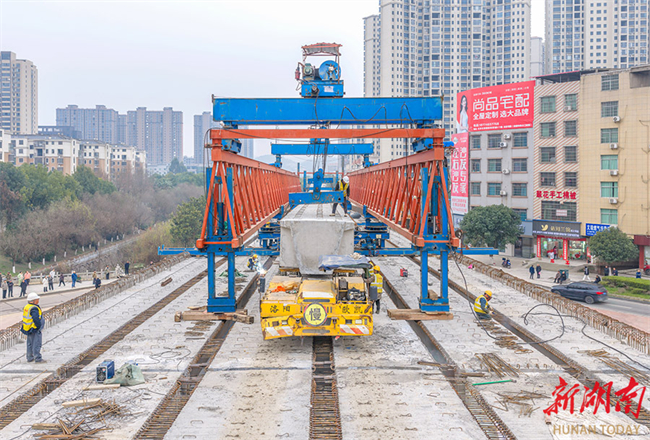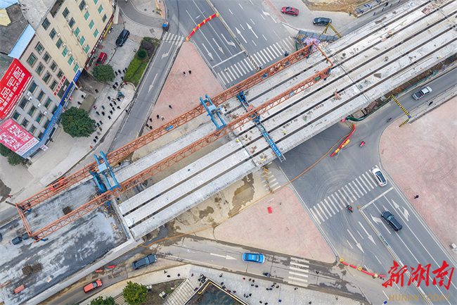The "at-grade to grade-separated" intersection construction project of Guantian Road and Hunan-Guangxi Railway in Dong'an County completed box girder installation of the 280-meter-long overpass bridge on January 29, achieving a critical milestone. This project is a key project related to people's livelihood in Dong'an County. The main route is constructed according to urban arterial road standards, with the bridge spanning 280 meters in length and 16 meters in width. Upon completion, it will enhance traffic safety and efficiency significantly. (Photo/Cai Xiaoping)