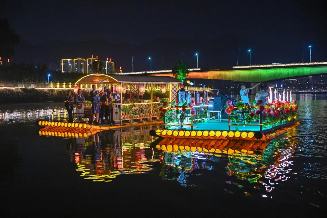 游客在郴州东江花月景点乘坐游船休闲游玩东江花月夜传统民俗表演