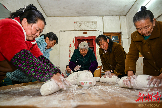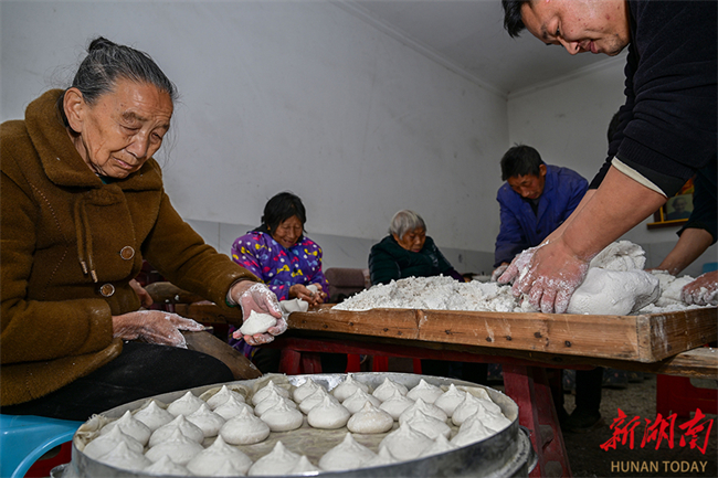 Villagers made Dingzi ciba, a kind of traditional New Year food made of glutinous rice, in Penggongmiao Village, Zhoumensi Town, Zixing City. As Spring Festival approaches, villagers gathered to prepare festive food, working together to knead, shape, and press steamed glutinous rice. The village was filled with laughter and joy, bustling with intense festive atmosphere. (Photo/He Honghai and Xiao Zhizhong)