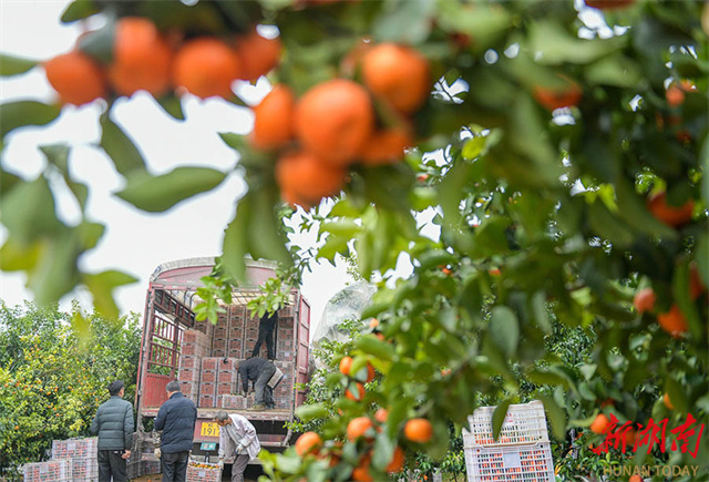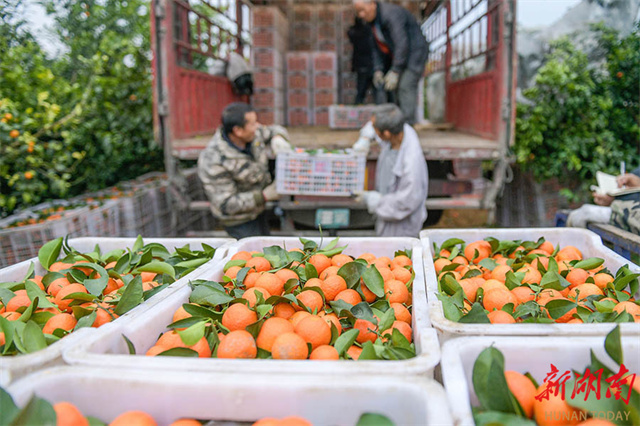 The photo shows fruit farmers are busy loading freshly picked sweet oranges onto a truck at a citrus cultivation demonstration base in Loutian Village, Qingtang Town, Daoxian County. Sweet oranges here have now entered harvest season. The freshly harvested oranges are being distributed nationwide via cold-chain logistics, ensuring stable market supply during the upcoming Spring Festival. (Photo/Jiang Keqing)