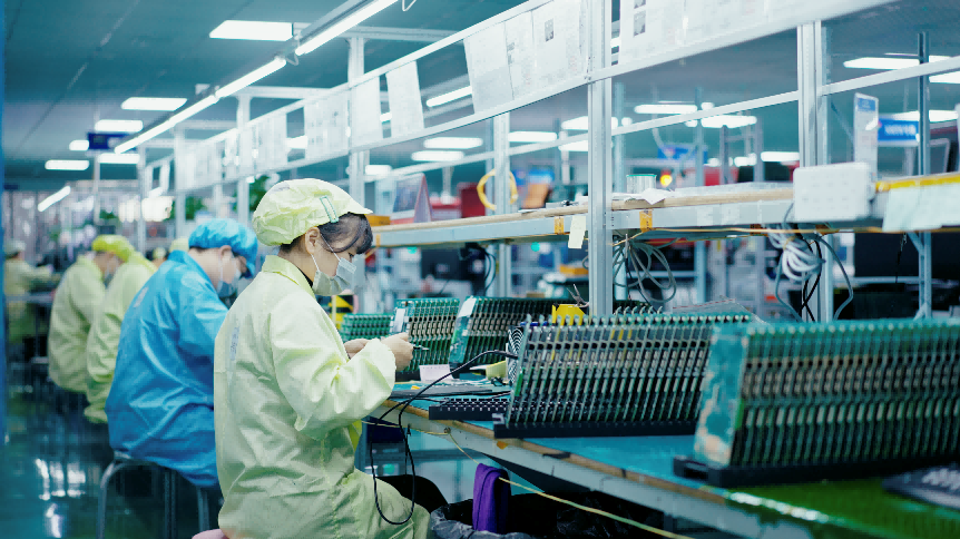 (迪文科技生产基地,工人正在组装显示屏。)