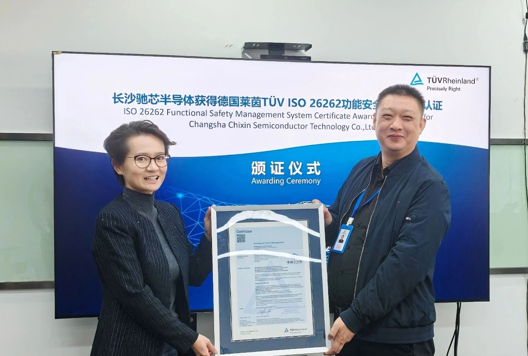 (近日,驰芯半导体获得德国莱茵TÜV集团颁发的ISO 26262功能安全管理体系ASIL D认证证书。)